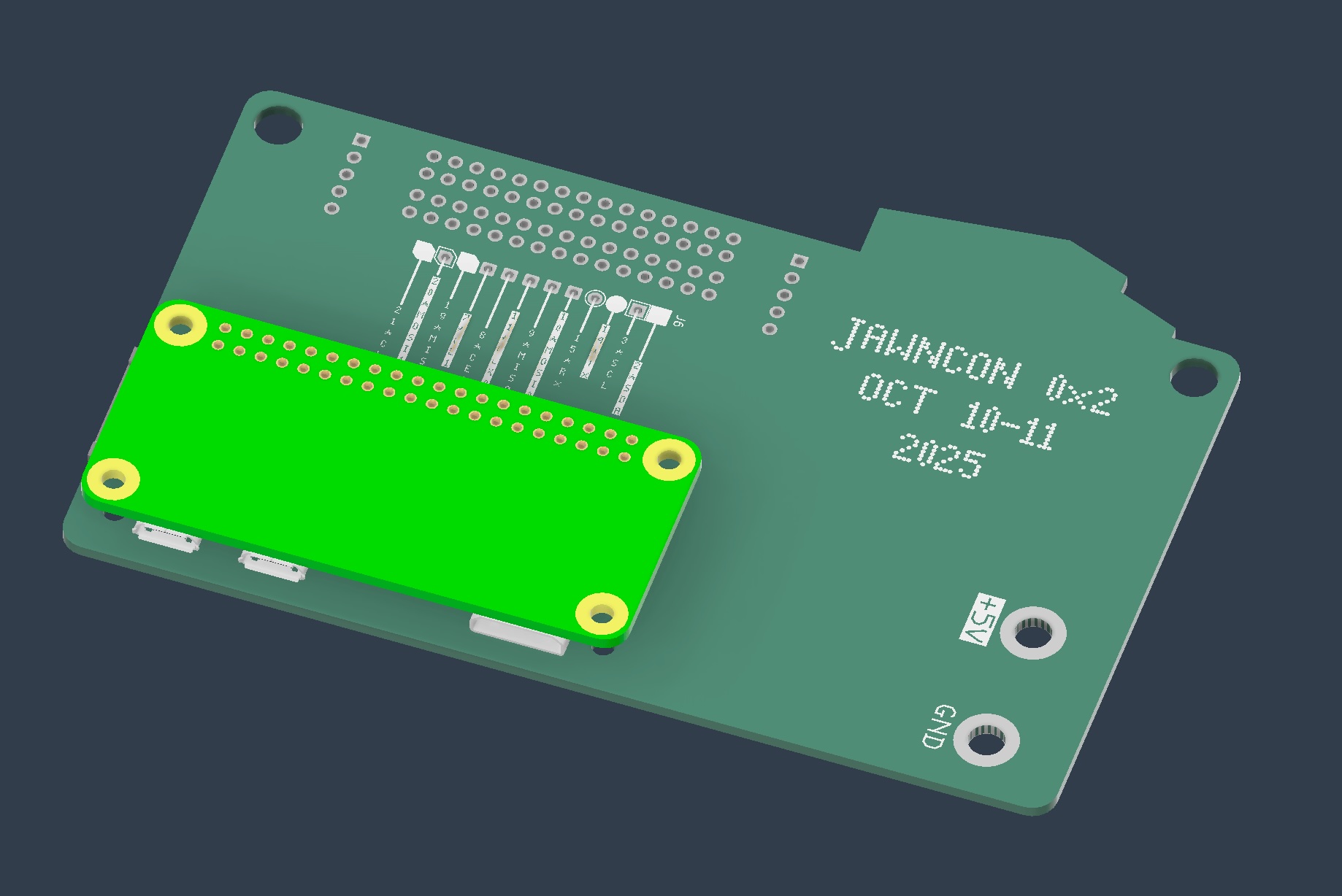 If you wish to mount your Raspberry Pi to the badge, the JawnCon badge mounts as a (large) hat on the Raspberry Pi: